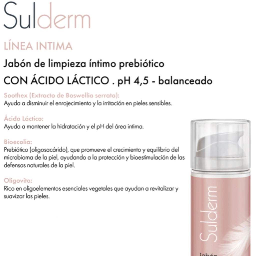Jabón líquido de limpieza prebiótico con acido láctico, específicamente para el área íntima de Sulderm.